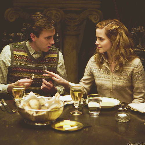 O.o nie kojarzę tej sceny? Może została wycięta? Albo ja mam już straszna sklerozę... Poza tym dziwne to zdjęcie, Hermiona wygląda na zakochaną...