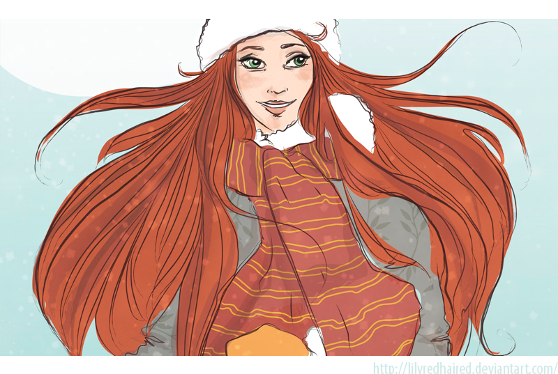 Ogólnie bardzo ładnie i ja nigdy w życiu bym czegoś takiego nie stworzyła, ale na tym rysunku już dla mnie za dużo tego rudego. Ona ma tyle włosów, że ten szalik mi psuje wrażenie.