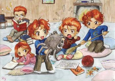 Pewnie to tak wyglądało jak byli dziećmi. Fred i George wariowali, Percy się uczył, Ron był poszkodowany a Ginny ich ignorowała.
