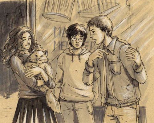 Bardzo mi się podoba ten fan art. Doskonale oddaje moje wyobrażenie tej sceny. Wściekły Ron, zakłopotany Harry i zadowolona Hermiona z kotem na rękach. No właśnie, Krzywołap! Tak śmiesznie, słodko i niewinnie wygląda, haha, mały diabełek