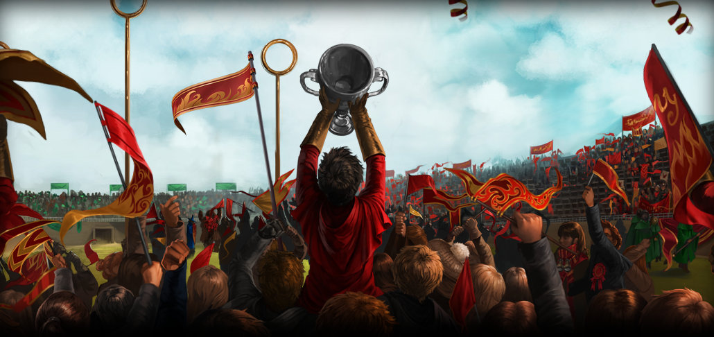 Bardzo ładny fan art. Świetne są te powiewające na wietrze chorągiewki z barwami Gryffa. I serpentyny... Aż przypomniałam sobie ten moment. ;D Te obręcze są tutaj bardzo wysokie. Przynajmniej ja takie odnoszę wrażenie. ;D