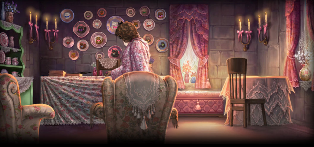 Gabinet Umbridge przedstawiony nawet fajnie, ale ten kolor i wszystkie ozdóbki aż mnie od tego obrazka odrzucają. To jest zbyt cukierkowe. Jak domek dla lalek a nie gabinet jakiejś profesorki...