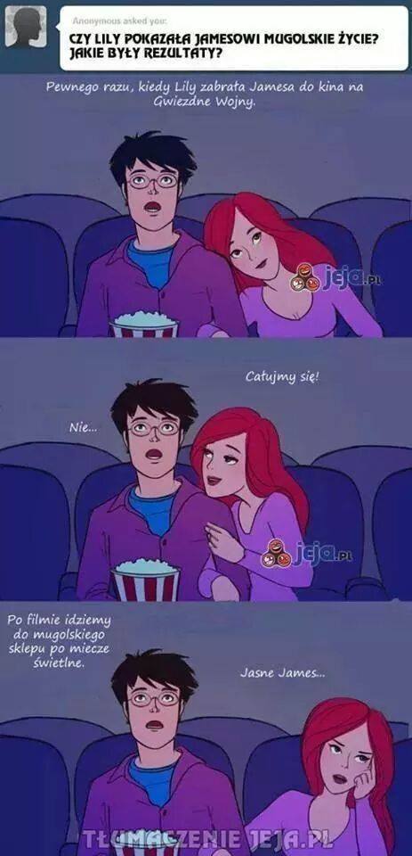 troche żenujące, myśle, że Lily by wyszła, ale co ja tam wiem. z Jamesa było wieczne dziecko więc bym nie była zdziwiona jakiego zachowaniem. jestem zdziwiona, ze czarodzieje chodzą do kina.