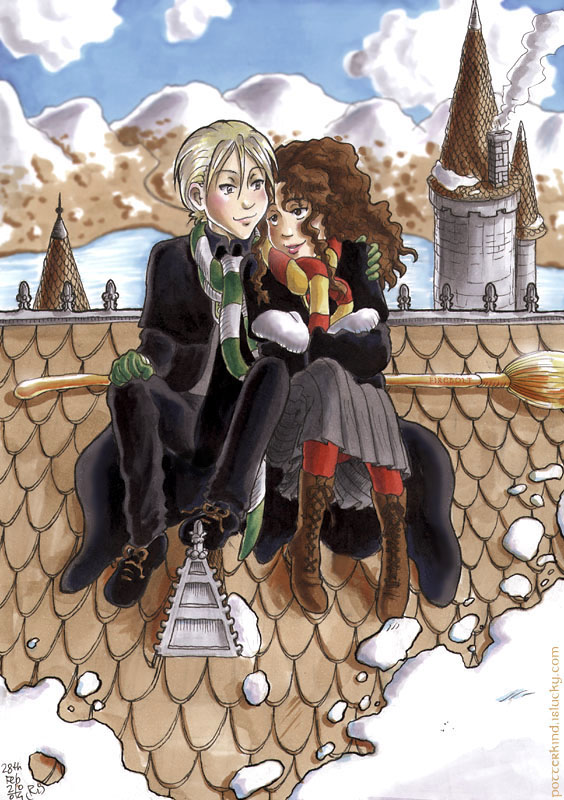 Rysunek dobry, ale tematyka mi nie pasuje... Serio?! Draco i hermiona?! O nie, nie, nie... Onie do siebie kompletnie nie pasują :| On przy pierwszej okazji by ją zepchnął z tego dachu. Taki trochę bajkowy rysunek... Wykonanie - ok, tematyka - nigdy