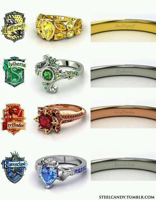 I znowu najbardziej podoba mi się pierścionek Krukonów! Wygląda cudnie, bardzo ładny niebieski i to serce! reszta jest trochę taka nijaka... Nie podoba mi się Hufflepuff, wszystko jest takie żółte, ble. Ślizgoński nie jest zły, ale pupy nie urywa.