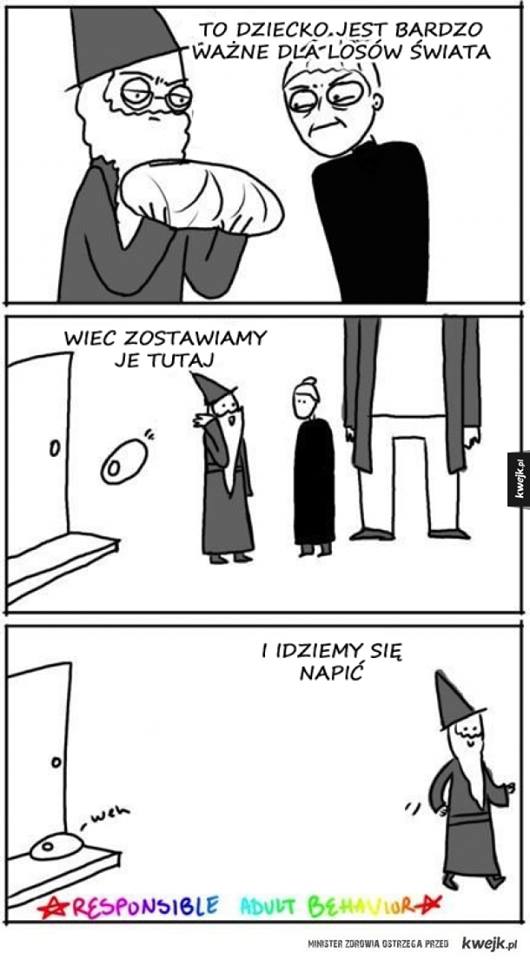 Już taki fanart komentowałem wcześniej. Taki mroczny humorek, ale faktycznie coś w tym jest. Właściwie nie wiem czemu nie mogli Pottera podrzucić rankiem, a nie w środku nocy... W sumie to nie było jakieś mega rozsądne i odpowiedzialne rozwiązanie. Lepiej się iść napić niż upewnić się czy dziecko bezpiecznie trafi w ramiona wujostwa