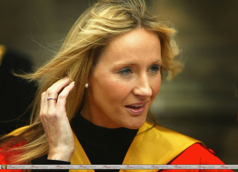 Pierwsza myśl, jaka mnie naszła, po zobaczeniu tego zdjęcia to "Czy pani J. ma na sobie szatę Gryffindoru?". Później jednak przeczytałam podpis pod zdjęciem i wszystko stało się jasne. ;D Rozumiem, że zdjęcie zostało zrobione "w momencie", ale brakuje mi tutaj ślicznego uśmiechu Rowling. ;x