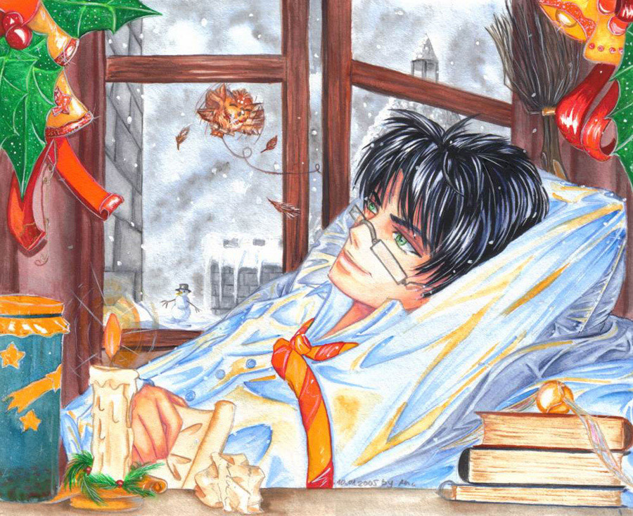 Harry wygląda tu jakby w szpitalu leżał czy gdzieś w podobnym miejscu (sanatorium, skrzydło szpitalne?). Jak dla mnie podkreślono tu te jego słynne zielone oczka ;p Wpatruje się w choinkę... Podejrzewam, że w coś innego.