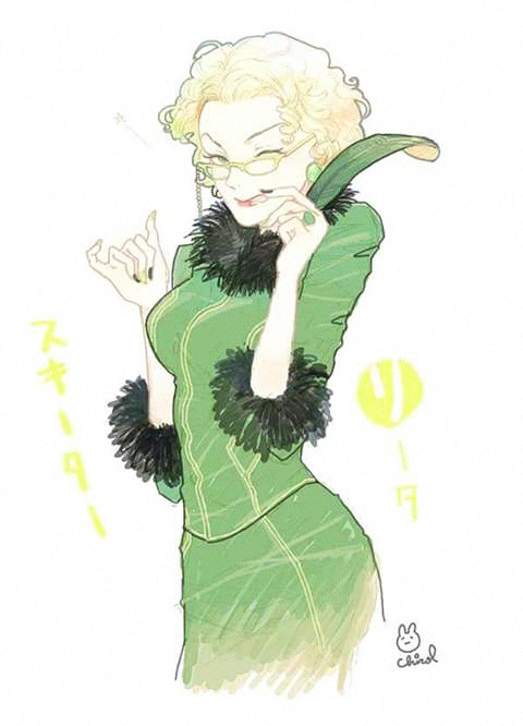 Rita wygląda tutaj flirciarsko. Ma takie dziwne zaostrzone pazury, oraz świetnie dopasowaną zieloną sukienkę. Te fajne... 'Coś' przy rękawach i szyi to takie o! futereło widzę że napisano to coś w kanji, szkoda że jestem słaba z japońskiego ._.