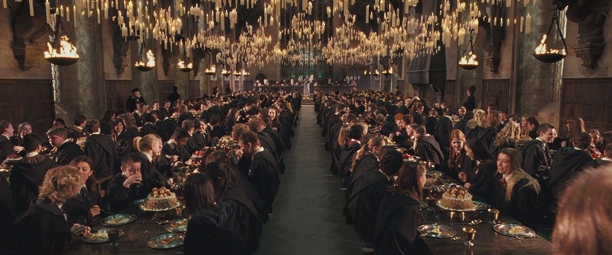 Wielka Sala wypełniona po brzegi głodnymi uczniami, którzy właśnie dotarli do Hogwartu by zacząć nowy rok szkolny. ogólnie nie przeszkadzało mi, że w każdej części o tym było. cały klimat niszczy tylko gdzieś ukrywająca się wśród tłumu różowa landrynka.