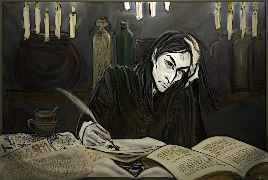 I po raz kolejne przedstawienie Severusa jako jakiegoś "księcia ciemności" czy innego Draculę ;p Chyba nie miał aż tak długich włosów, chociaż kto wie. Ciekaw jestem nad czym on tak intensywnie duma? Tworzy własne zaklęcie czy może pisze do wybranki swojego serca?