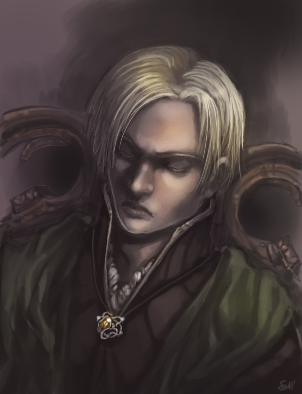 Był taki wampir (w jakimś serialu), a może demon (?) - identyczny. Jak dla mnie to ktoś opętany, jakaś zmora, upiór, a nie akurat panicz Malfoy, który jak diabeł nie wyglądał. Niemniej przyznaję, że bardzo, ale to bardzo ciekawie przedstawiony fanart.