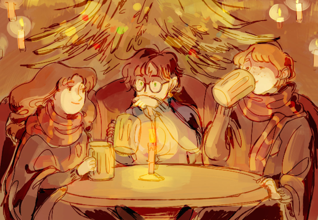 ..ale może być. Ron chyba zaraz zaśnie na tym krześle, ale jeszcze dopije do końca. Harry'emu się chyba czknęło i próbuje to zataić przed Hermą, a Hermiona delektuje się chwilą.