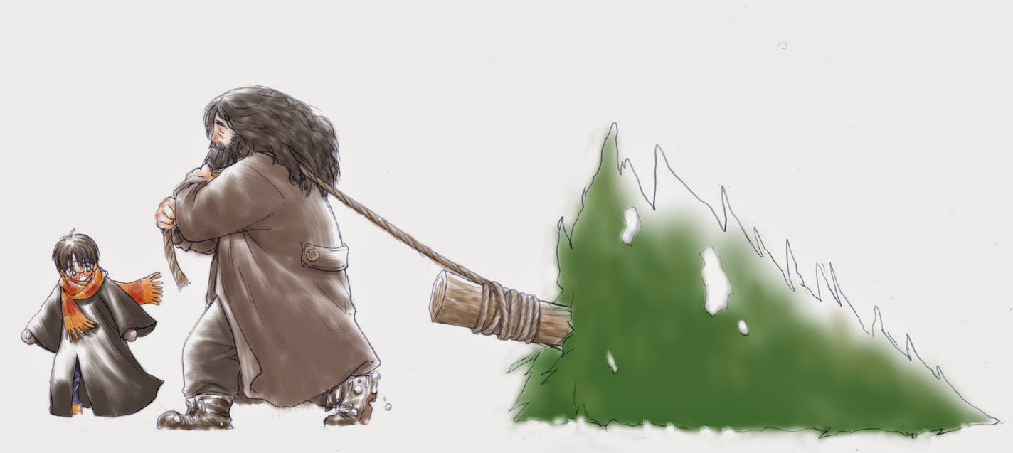 Hageid dźwiga drzewo na salę, a Harry mu pokazuje drogę. Zawsze sobie wyobrażałam że to drzewo ma na ramionach, a nie wlecze po ziemii, ale to wizja autora, prawda?