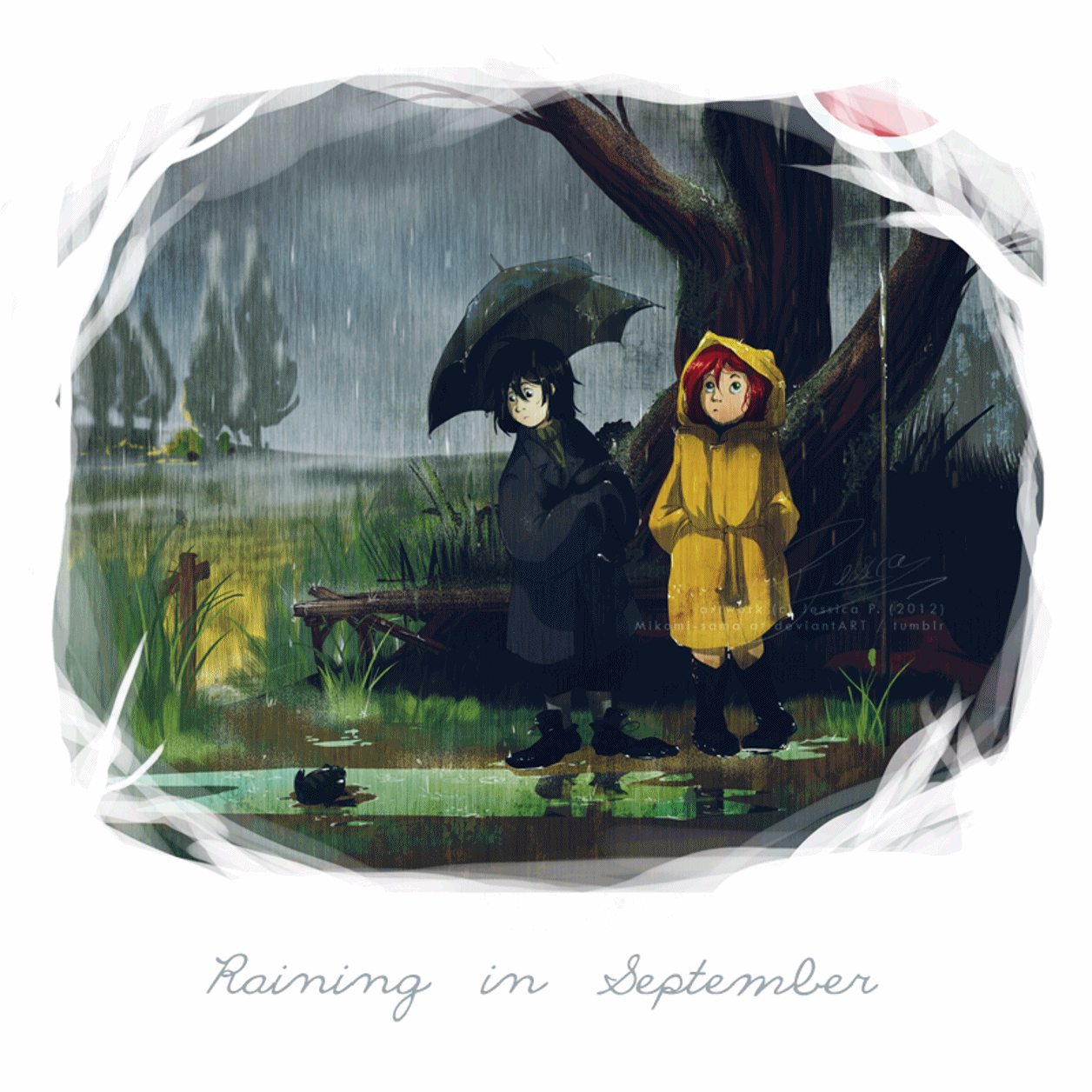 Podoba mi się ten fan art. Uwagę przyciągają dobrze dobrane kolory, obrazek nie jest ani zbyt ciemny i ponury, ani nie przekolorowany. Wydaje mi się, że Lily i Severus są gdzieś w okolicy swojego miejsca zamieszkania. Bardzo lubię fanarty o zdarzeniach, które nie były przedstawione w książce, ale mogły się wydarzyć, jak chociażby ta scena.