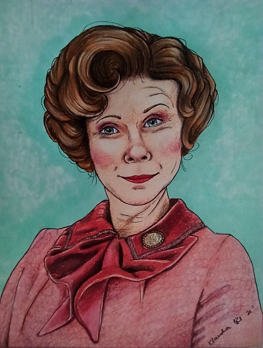 Dolores na tym rysunku spełnia przede wszystkim najważniejszy z warunków jakie należałoby postawić, zabierając się za ocenę pracy. Już samym wyglądem, wzbudza niechęć i jakiś rodzaj odrazy. Ten jej głupi cwaniacki uśmieszek przez, który już od samego początku czuć, że nie jest to osoba budząca ogólną sympatię. Myślę, że srogość o której piszesz w opisie, mogłaby jej to zabrać. Po za tym przecież Umbridge nawet w chwilach gniewu na twarzy miała właśnie ten charakterystyczny uśmiech, budzący odrazę w uczniach Hogwartu. Bardzo podoba mnie się kolorystyka, która nie bije po oczach, a jednocześnie zgadza się z książkowym wyobrażeniem postaci. Sposób w jaki narysowałaś oczy i nos dodaje jej realizmu, który może sprawić, że bardziej wyczulonym profesor D.U będzie się śnić po nocach. Dla mnie praca na W!