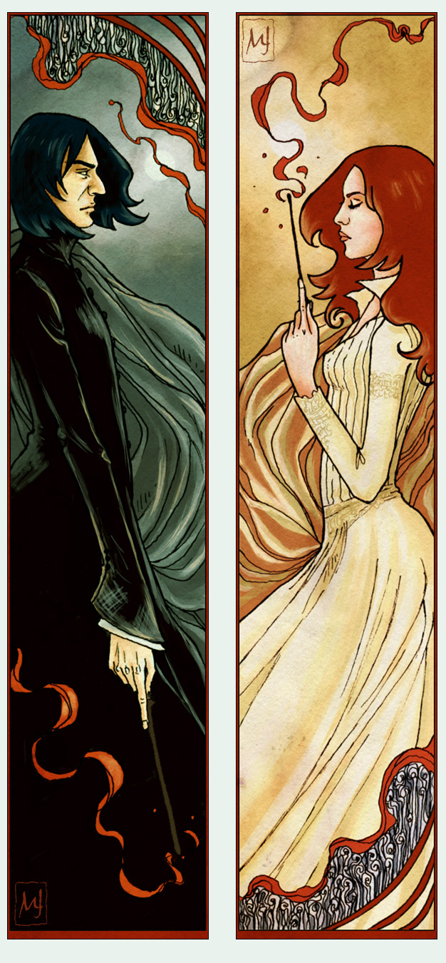 Bardzo ładny fan art. Podoba mi się tu zarówno przestawienie Severusa, jak i Lily, moim zdaniem świetnie pokazano tu jej włosy. No i Snape, jako jej zupełna przeciwność, w ciemnych szatach i z przygnębieniem na twarzy. Szkoła, że ich przyjaźń skończyła się w tak głupi sposób.