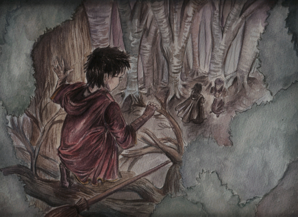 Bardzo podoba mi się to, jak ktoś narysował szatę Harry'ego. Ona nie jest dobra. Ona jest BOSKA. I te fałdy materiału. Naucz mnie kto. Bardzo fajne drzewka i cała sceneria. Ale Harry wydaje się taki strasznie mały.