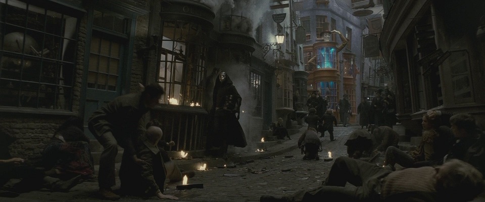 Czyli to ma być ten moment, w którym porywają Ollivandera. W książce tylko o tym wspomnieli, że "zniknął", a tu tak t ukazane, choć nie było przecież wiadomo kogo dokładnie na tej ulicy Pokątnej wówczas śmierciożercy porwali. Też taka bajka trochę - bo pojawili się ni stąd ni zowąd
