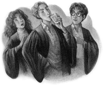 Lubię Rona z ilustracji Mary GrandPré, ładnie wygląda, zwłaszcza z tyłu okładki KP, chociaż jest trochę za mało piegowaty i nie potrafię go sobie wyobrazić z falowanymi włosami. Podobnie jak Harry'ego, uparcie wyobrażam go sobie z prostymi, choć w sumie nigdy ich tak nie opisano. Hermiona bardzo do siebie podobna, Wybraniec tak samo, dałabym mu tylko nieco drobniejszy nos. I wydaje mi się, że w tym momencie Harry i Ron powinni siedzieć przy stole, ale nie chcę się za bardzo czepiać, gdyż jest to jedna z moich ulubionych ilustracji w całej serii, top 5 na pewno ^^ Rozdział też świetny, jak dla mnie jeden z najciekawszych w Księciu Półkrwi.