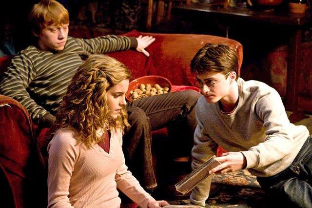 scenę doskonale pamiętam. dużo było jęczenia o ten piekielny podręcznik, który w sumie nie był zły. pierwsze co przykuło moją uwagę na tym zdjęciu to mina Rona, który patrzy na Hermione i Harry'ego.