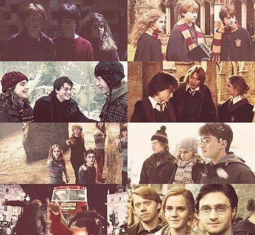 Kolaż fajny. Takie porównanie naszego Trio ze wszystkich lat nauki. Drażni mnie tylko to ostatnie zdjęcie. Jakoś nie przypadł mi do gustu epilog książki, więc jego ekranizacja też mnie nie zachwyciła. No i jedno pozostaje zawsze bez zmian - nieśmiertelne okulary Herry'ego